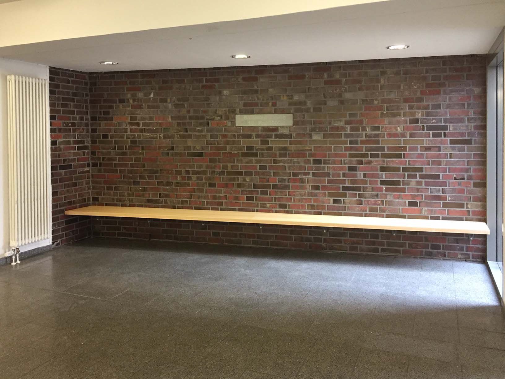 Möblierung in öffentlich Fluchtwegen dürfen gemeinhin keine Brandlasten aufweisen. Daher ist heute eine nichtbrennbare Ausführung vorgeschrieben. Dies ist für die Arbeit des Tischlers zunächst eine ganz große Einschränkung. Zum Glück können wir heute nicht brennbare Trägermaterialien verarbeiten. Im Einzelfall wird eine Lösung mit den zuständigen Behörden gesucht.