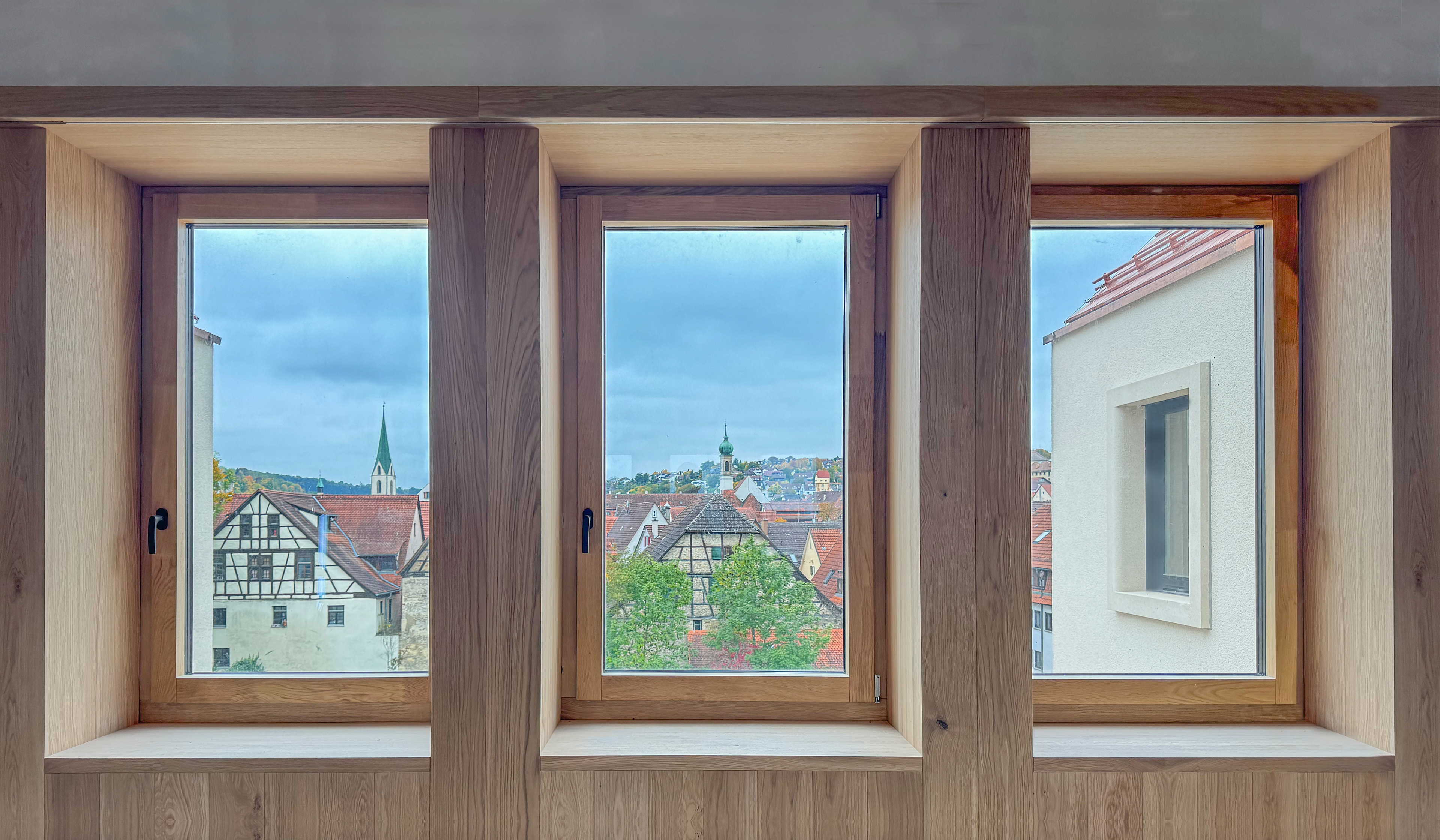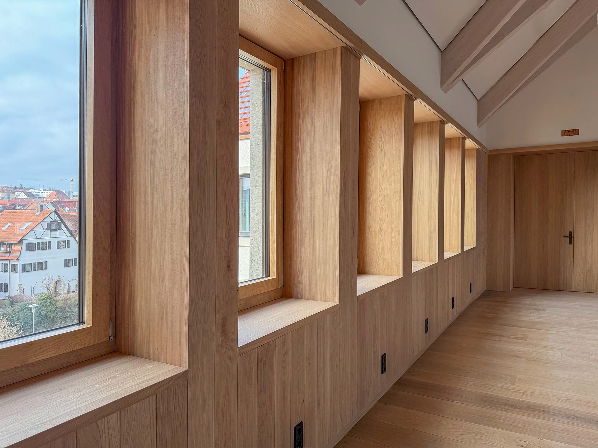 Eichen-Aussentüren, Pfosten/Riegel-Konstruktion + Ahorn-Decke