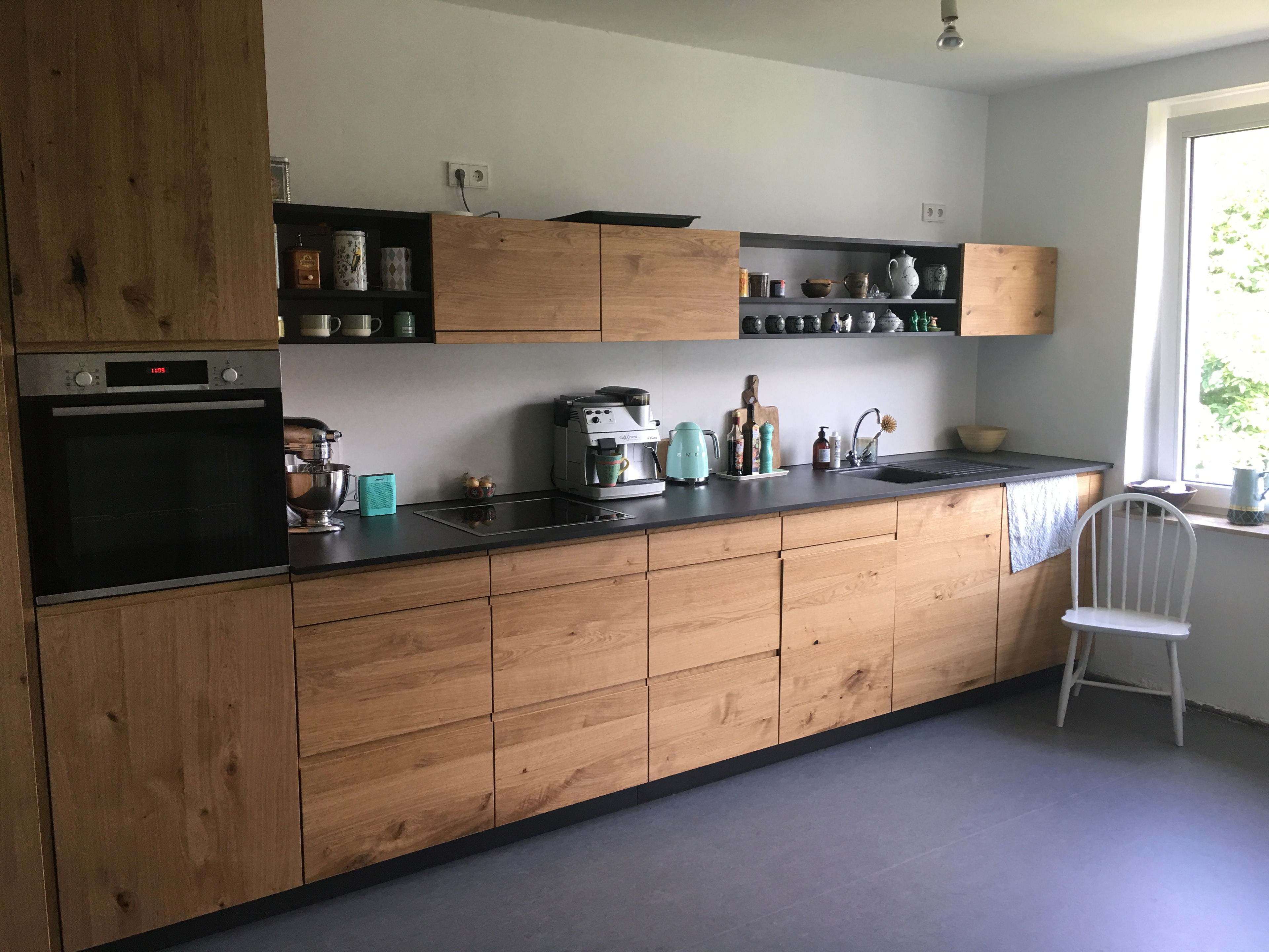 Küche, lebhaftes Eichenfurnier, CDF-Arbeitsplatte, Spüle flächenbündig, Werksentwurf 2018